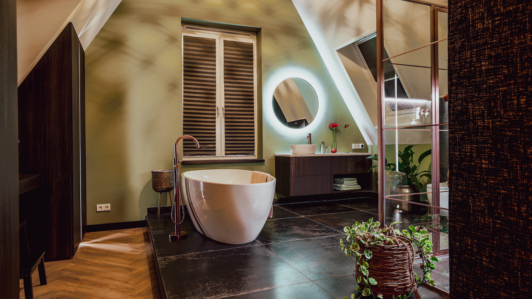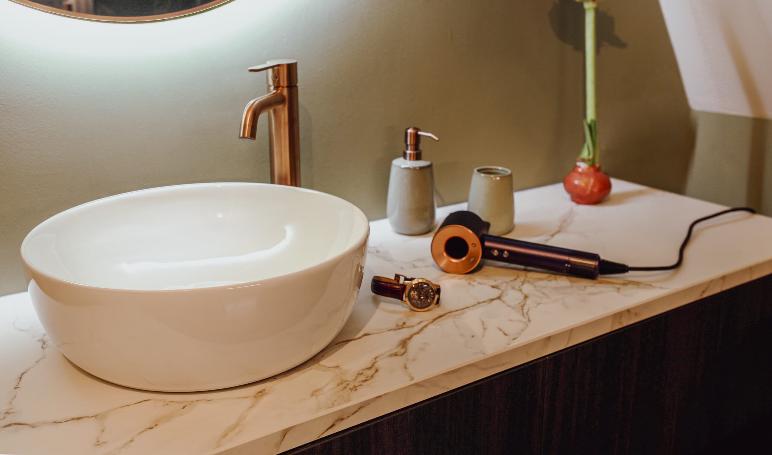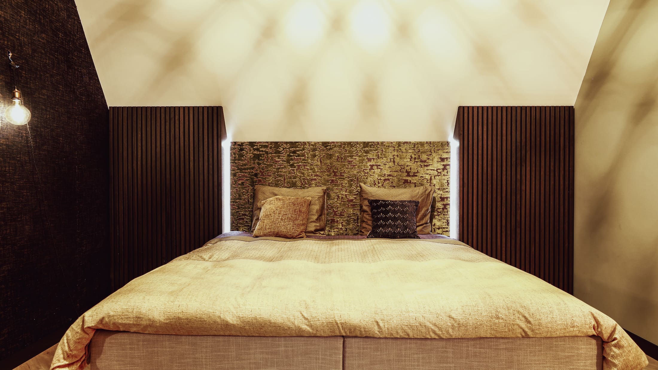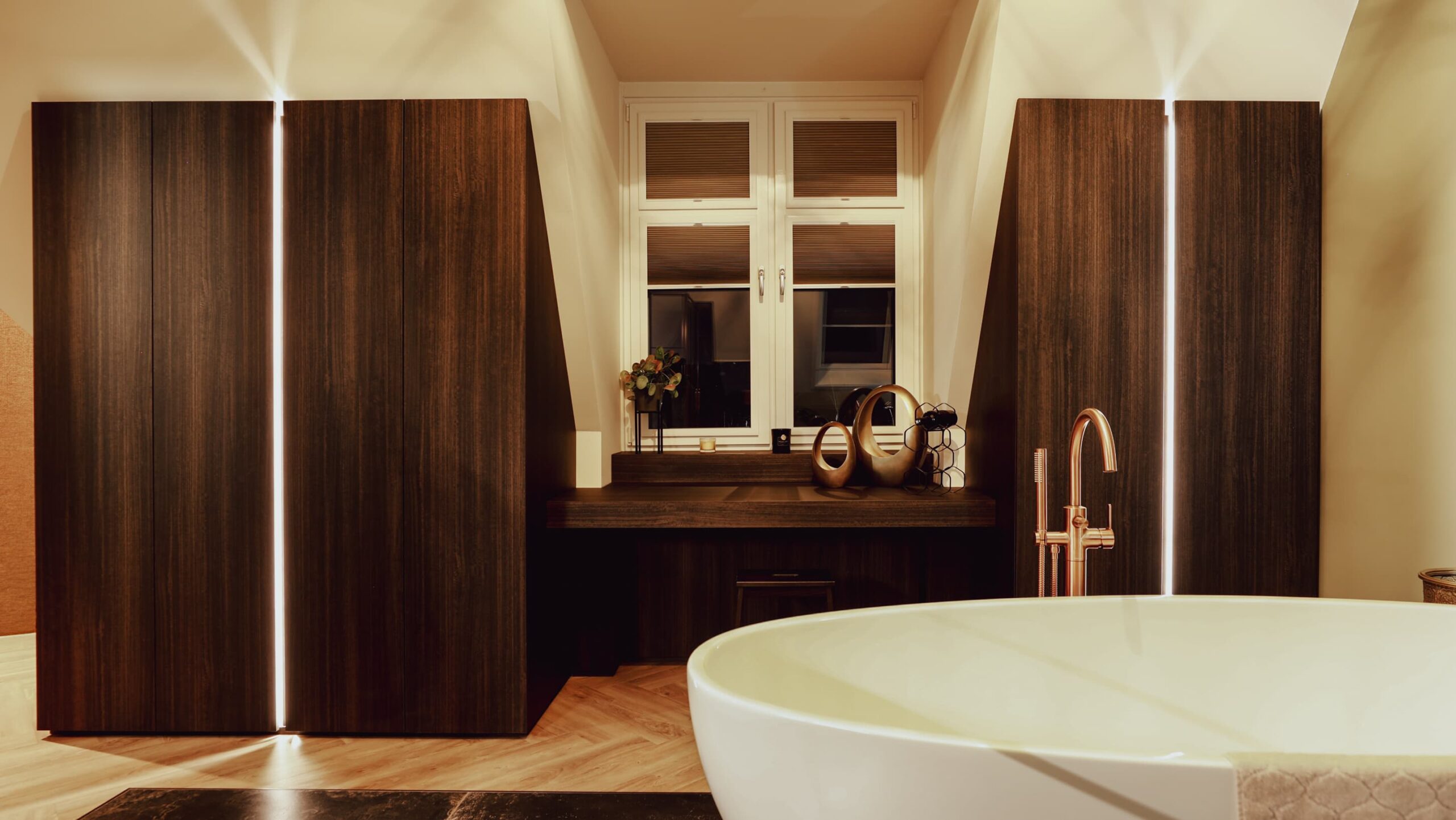 In Spaarndam mochten we deze prachtige loft realiseren in een vrijstaande villa. Het uitgangspunt: een exclusieve suite voorzien van alle gemakken. De ruimte bevat een loungehoek en een raamzitje waar je in de ochtend kunt genieten van de opkomende zon met een heerlijke kop koffie. Naast een badkamermeubel en verschillende luxe kasten hebben we ook het bed ombouw en een make-up tafel gerealiseerd. De buitenzijde van de kasten zijn voorzien van LR29 Riga Dit materiaal heeft een warme en rustige uitstraling. De binnenzijden van de kasten zijn uit een koperlook materiaal vervaardigd voor een luxe uitstraling. Zowel aan de binnen- als de buitenzijden van de kasten is (sfeer)verlichting ingebouwd.